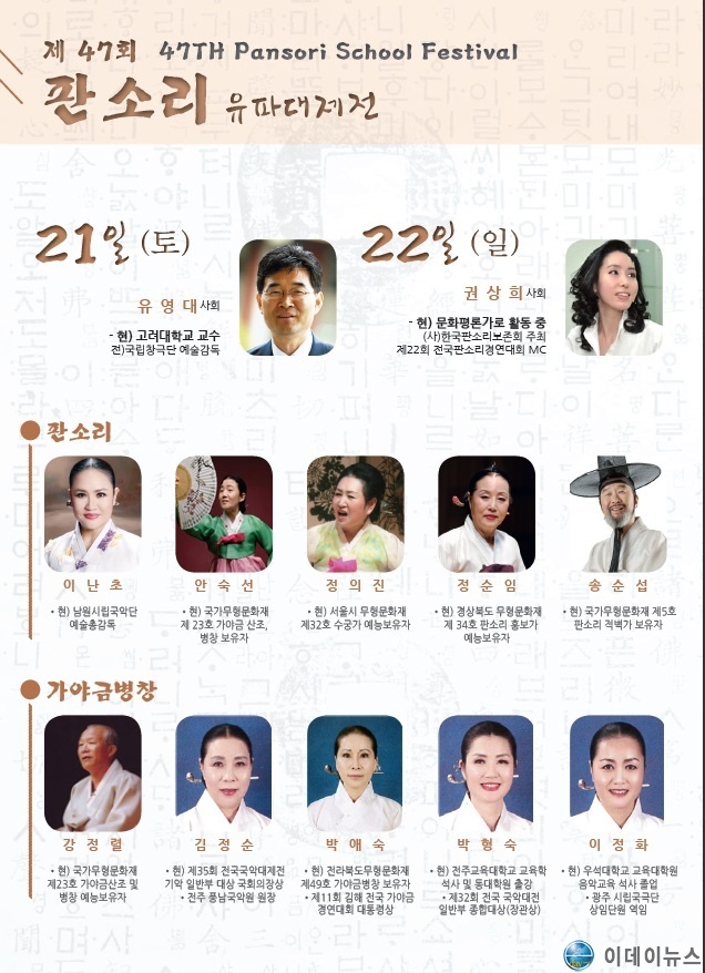 판소리 유파대제전은 지난 1971년 각 유파별 원로 명창들이 유파의 전승보존을 위해 개최한 유파발표회에서 시작해 올해로 47회를 맞이한 행사이다.