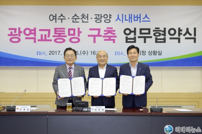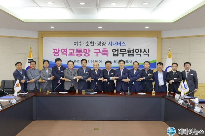 이와 관련 25일 광양시청 상황실에서 3개 시는 내년 1월 1일자로 시내버스 광역교통망을 개통하고, 내년 6월 이전까지는 광역무료환승을 시행하기로 전격 합의하고 업무협약식을 가졌다.
