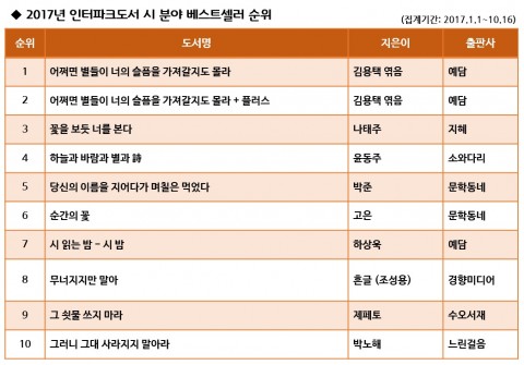 인터파크도서 송현주 시ㆍ에세이 MD는 "어렵고 현학적인 시보다는 누구나 쉽게 읽고 공감할 수 있는 시집의 판매가 꾸준한 편이다. 또 현시대를 살아가는 청년들에게 위로의 메시지를 전하는 젊은 시인들의 시집 출간도 많았다"고 말했다.