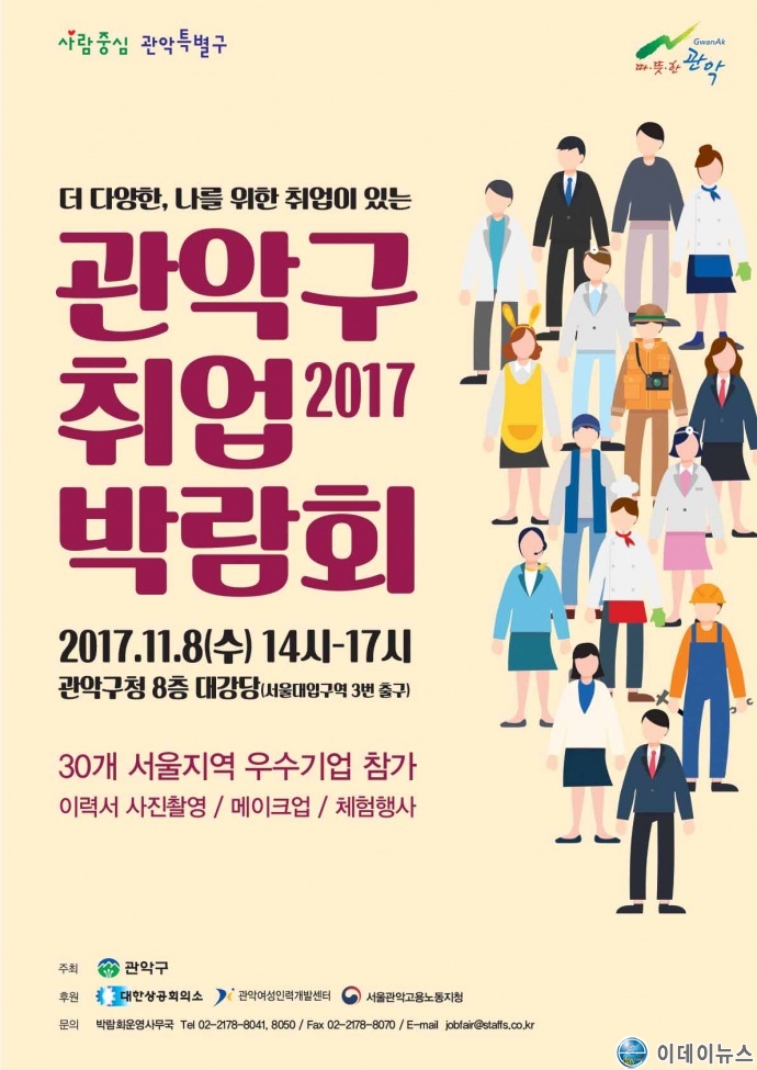 관악구(구청장 유종필)가 오는 11월 8일 오후 2시부터 관악구청 8층 대강당에서 ‘2017 관악구 취업박람회’를 연다.