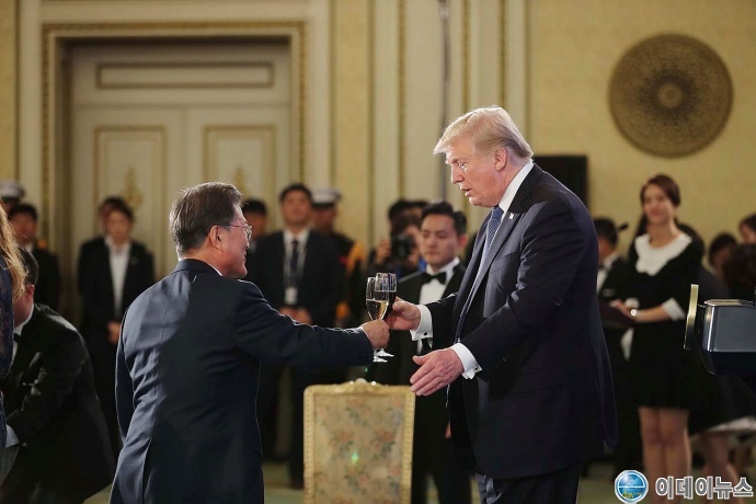 문재인 대통령은 7일 저녁 8시부터 10시25분까지 국빈 방문한 도널드 트럼프 미국 대통령 내외를 영빈관으로 초청해 만찬을 가졌다.