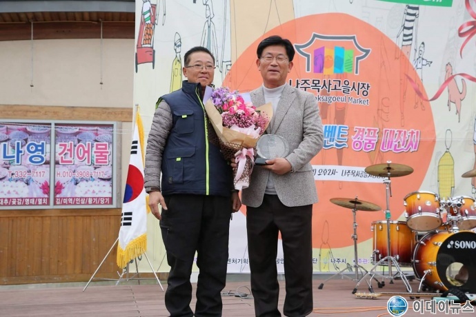 이날 김장맞이 고객이벤트 경품대잔치 행사를 개최한 목사고을 상인회는 나주사랑상품권 이용 협약체결을 비롯해 노후시설 개선 등을 적극 추진해오며, 서민경제 버팀목인 전통시장 활성화에 기여해온 강 시장에게 감사패를 전달했다고 밝혔다.