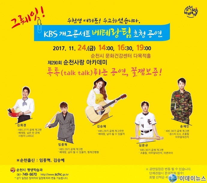 24일 오후 2시부터 진행되는 제290회 순천사랑아카데미는 KBS 개그콘서트에서 현재 활발하게 활동 중인 개그맨들로 구성된 ‘베테랑’팀을 초청해 청중과 만날 예정이다.
