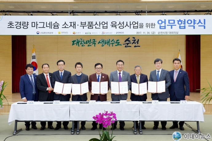 순천시는 24일 시청 대회의실에서 산업부, 전남도 및 재료연구소, 전남테크노파크, POSCO와 ‘초경량 마그네슘 소재․부품산업 육성을 위한 업무협약’을 체결했다.