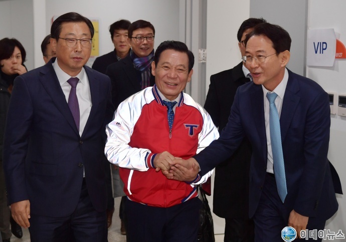 윤장현 광주광역시장(가운데)이 1일 오후 광산구 광주여대 시립유니버시아드체육관에서 KIA타이거즈 선수단과 시민 6천여명이 참석한 가운데 열린 'KIA타이거즈 V11 팬 페스트' 행사에 참석하기 위해 박한우 KIA 타이거즈 대표이사(왼쪽), 허영택 KIA 타이거즈 단장의 안내를 받으며 입장하고 있다.