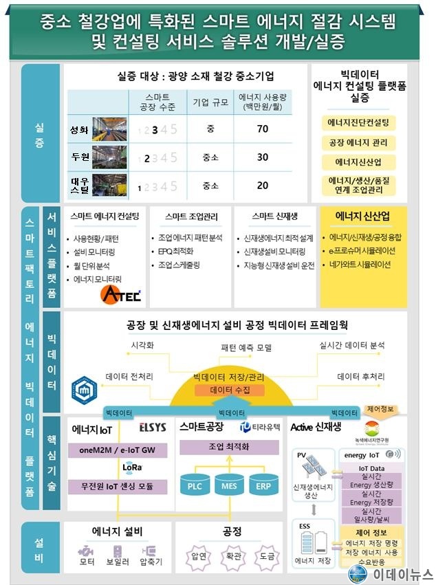 ㈜엘시스는 철강공장의 스마트 에너지 절감 TOC(Theory of Constraints) 플랫폼 설계와 개발을 추진하고, (재)녹색에너지연구원은 신재생에너지 등 에너지 절감 인프라를 구축한다. ㈜티라유텍은 조업 패턴을 예측하는 알고리즘을 개발하며, ㈜아텍에너지는 스마트 에너지 솔루션 성능 검증 기술을 개발한다.