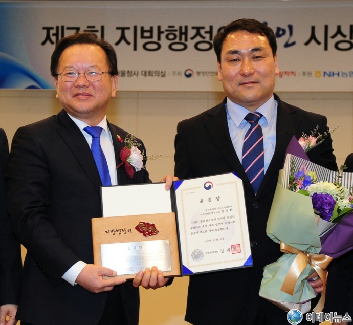 광주광역시 상수도사업본부 급수과 김정환 주무관이 19일 오후 정부서울청사에서 열린 '2017년도 제17회 지방행정의 달인' 행사에서 지역개발분야(상수도시설물 작동과 관리 및 작동의 달인) 행정의 달인으로 선정돼 표창장을 받고 있다.