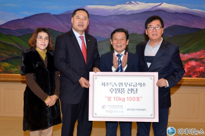광주광역시는 (사)한국외식업중앙회 광주시지회(지회장 김상재)와 에프엔디 협동조합(이사장 윤나경)이 연말연시를 맞아 광주공원 사랑의 쉼터 무료급식소에 쌀 10kg들이 100포를 전달했다고 20일 밝혔다.