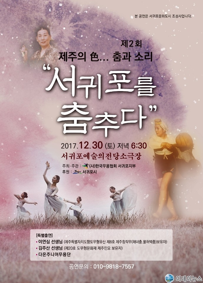 제주특별자치도(도지사 원희룡) 서귀포무용협회(지부장 김하월)는 제주의 춤과 소리를 예술혼으로 담고자 “제2회 제주의 色……. 춤과 소리“ 서귀포를 춤추다.”를 30(토)일 오후 6시 30분 서귀포예술의전당 소극장에서 개최한다.