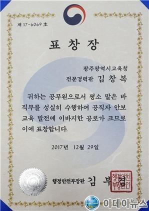 광주광역시교육청 총무과 김창복 전문경력관은 공직자들의 올바른 국가관과 안보관을 확립한 공로를 인정받아 행정안전부장관 표창을 받았다고 29일 밝혔다.