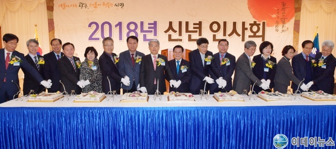 윤장현 광주광역시장이 4일 오후 광주테크노파크 주관으로 과학기술진흥원 그랜드볼룸에서 열린 ‘2018 첨단산단 산학연관 신년 인사회’에 참석해 새해 인사를 나눈 뒤 김동철 국회의원, 이은방 시의회 의장, 배정찬 광주테크노파크 원장 등 내빈들과 떡 케이크를 자르고 있다.