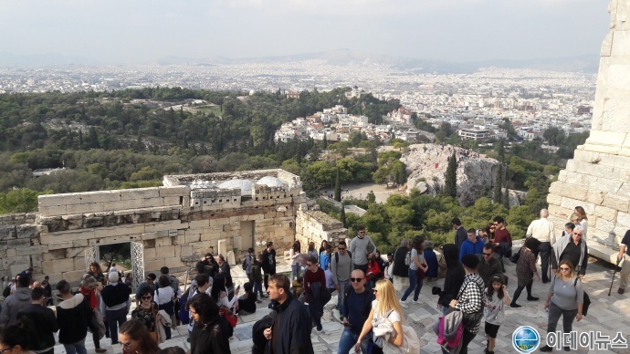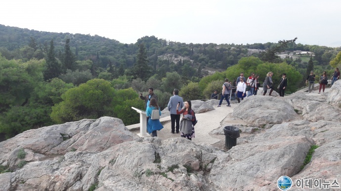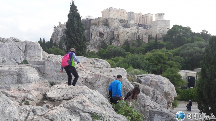 이제 아크로폴리스를 내려온다. 현관인 프로필라이아에서 서쪽 출입구를 내려다보니 오른 편 아래 바위에 사람들이 꽤 많다. 현지 가이드에게 물으니 그곳이 아레오파고스란다. 아레오파고스라면 사도 바울이 설교했던 곳 아닌가.