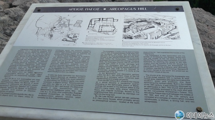 이윽고 아레오파고스 언덕 (Areopagus Hill) 안내판을 보았다. 여기에는 3가지가 적혀 있다. 첫째 아레오파고스의 위치 둘째 아레오파고스의 유래, 셋째 바울의 전도와 그리스 최초의 주교 디오누시오이다.