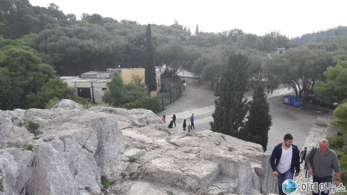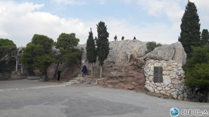 이제 아레오파고스 언덕을 내려온다. 정면에서 언덕을 보니 오른편에 동판이 있다. 이 동판에는 사도 바울이 아레오파고스에서 연설한 사도행전 17장 22절 이하의 구절이 적혀 있다.