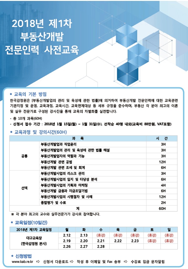 「부동산개발업의 관리 및 육성에 관한 법률 시행령」에 따라 부동산개발 전문인력 자격요건을 갖춘 교육대상자는 이번 제1차 사전교육에 교육 신청서를 접수할 수 있다. 신청서는 오는 31일까지 교육 담당자 이메일(k25835@kab.co.kr)로 접수가 가능하다.