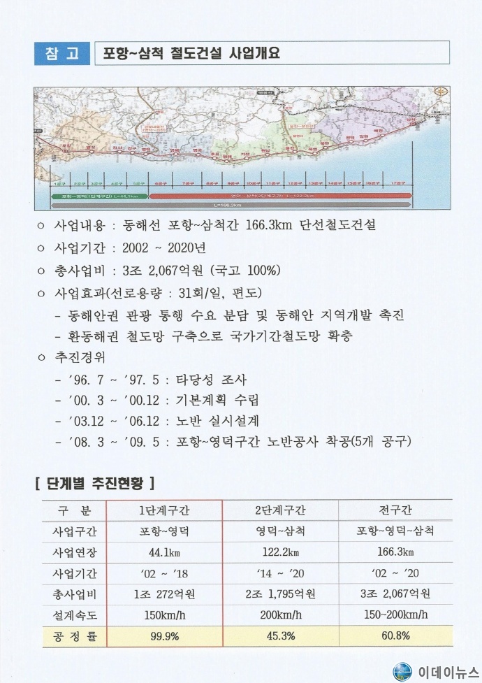 이번에 개통하는 포항~영덕 구간은 포항~삼척 간 총 166.3㎞ 단선철도 중 44.1㎞에 해당하는 구간이다. 지난 2009년 4월 착공한 이후 총 사업비 1조 272억 원을 투입, 월포, 장사, 강구, 영덕 등 역사 4개소를 신설하였다.
