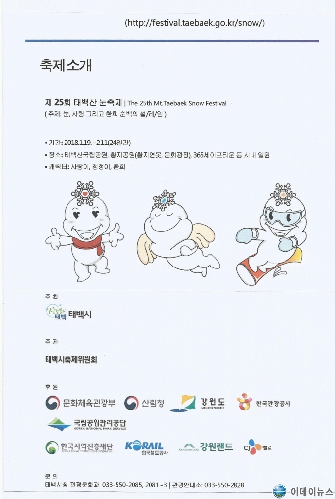 한편, 제25회 태백산 눈축제는 1월 19일부터 2월 11일까지 총 24일간 태백산국립공원과 황지연못, 태백문화광장 등 시내일원에서 개최되며, 365세이프타운에서는 축제 기간 중 다양한 할인이벤트도 진행한다.