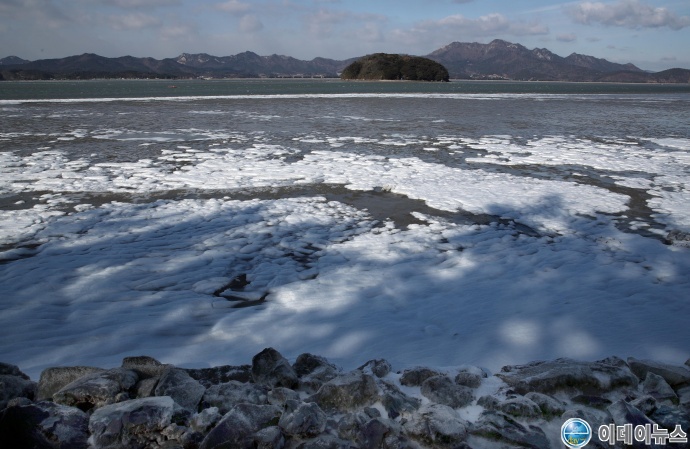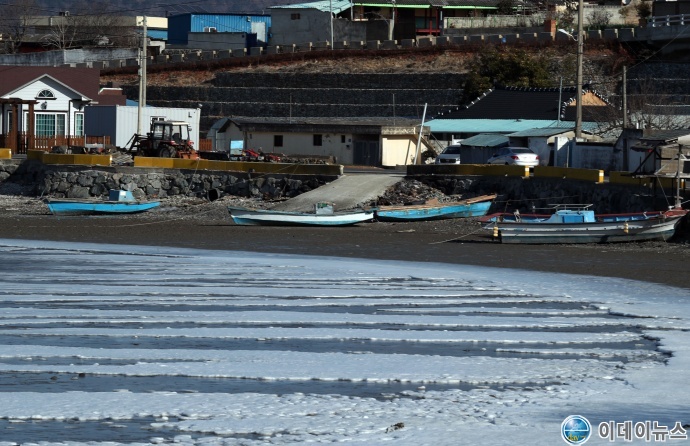 한파가 이어진 지난 25일 옹기마을로 잘 알려진 전남 강진군 칠량면 봉황마을 바닷가가 엄청난 추위에 눈이 쌓인 것처럼 얼어 매섭게 부는 칼바람과 함께 동장군의 위력을 실감나게 하고 있다.