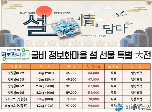 영광군 정보화 마을에서는 민족 고유 명절인 설을 맞이하여 지역 특산품을 수요자에게 보다 좋은 가격으로 제공하는 인터넷 특판 행사를 개최한다.