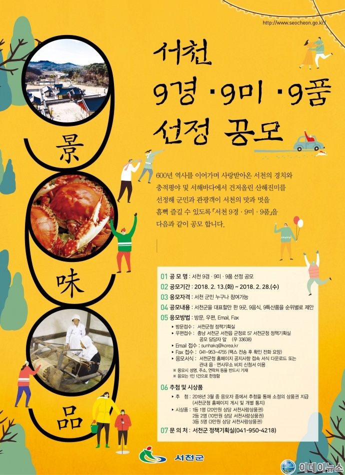 서천군(군수 노박래)이 지역 문화 관광 콘텐츠를 이끌어 갈 서천 9경·9미·9품 선정 공모에 나섰다.