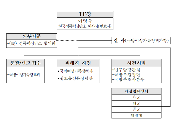 이명숙 한국성폭력상담소 이사장이 TF장을 맡고, 국방부 보건복지관실과 법무관리관실, 국방부 조사본부, 국방부 검찰단, 각 군 본부 양성평등센터, 성고충전문상담관 등으로 구성된다. 외부자문기관으로 한국성폭력상담소협의회도 참여한다.