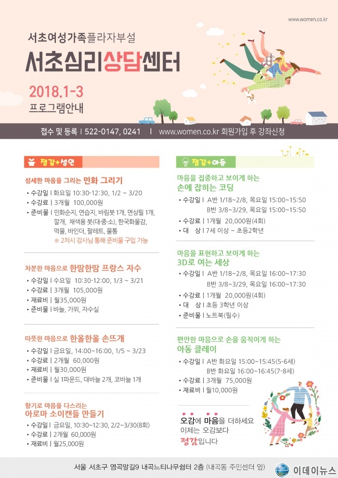 서초심리상담센터의 정감더하기 프로그램은 음악·미술적 요소, 신체를 통해서 자신의 마음을 표현한다. 더불어 타인과 교감하는 상호작용을 통해 본인의 마음과 감정을 타인에게 충분히 이해받는 경험을 할 수 있도록 진행된다. 지난 1월부터 진행된 이 프로그램은 올해 계속 이어질 예정이다. 자세한 내용은 홈페이지(www.women.co.kr)에서 확인할 수 있다. 문의 : 522-0147/0241
