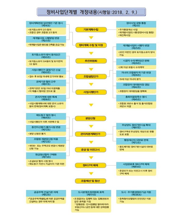 새로운 개정안에는 재개발사업과 도시환경정비사업을 `재개발사업`으로 통합하고, 재건축사업은 `재건축사업`, 주거환경개선사업과 주거환경관리사업은 `주거환경개선사업`으로 구분했다.