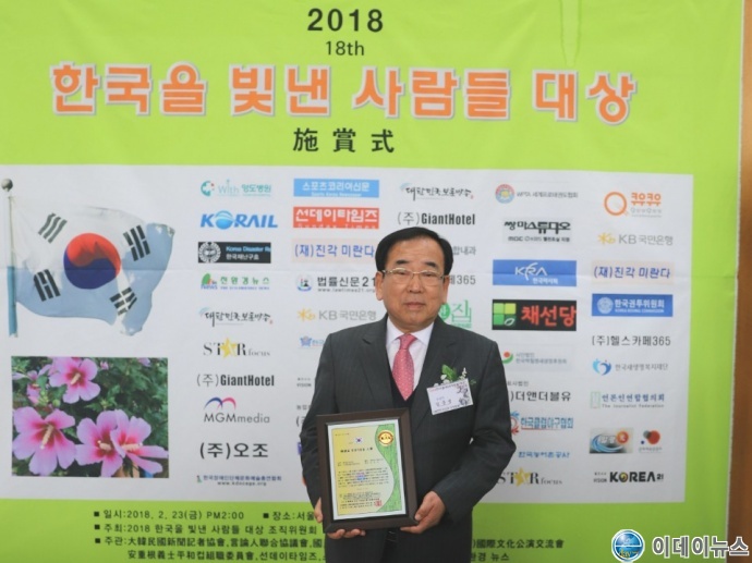 대한민국신문기자협회가 주관하고 KBS 등에서 후원한‘2018 한국을 빛낸 사람들 대상’은 사회 각 분야에서 성공적으로 정착한 정치, 경제, 사회 전반의 성공 모델을 제시하여 한국인으로서의 일체감을 조성하고 대한민국 구성원으로써의 자긍심을 갖고 살아 갈수 있도록 격려하기 위해 선정·수상하는 상이다.