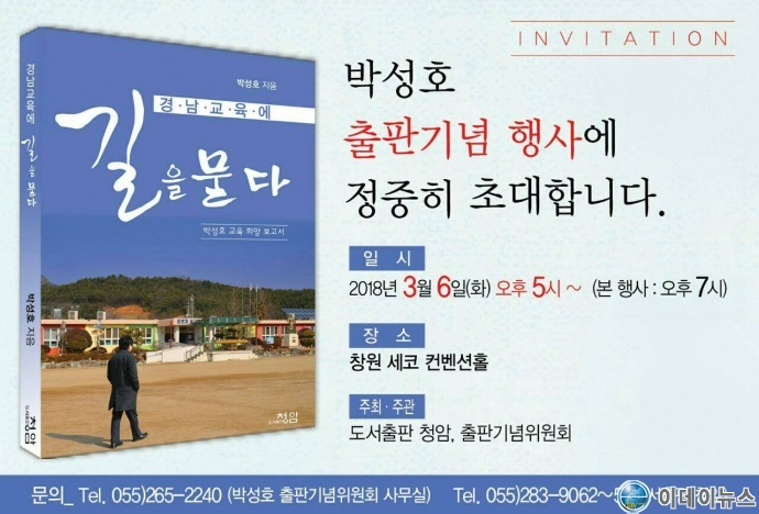전 국립 창원대학교 총장 박성호는 오는 6일 오후 6시 창원 세코 컨벤션홀에서 ‘경남교육에 길을 묻다’ 저자 사인회를 개최한다.