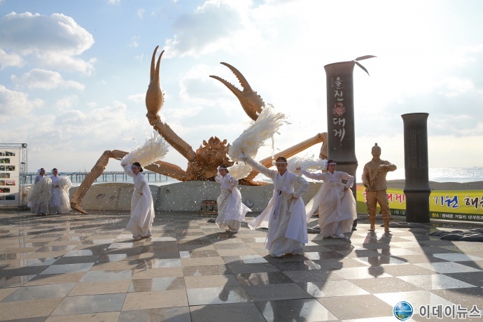 축제는 1일 오전 8시30분 ‘울진대게 원조마을’인 평해읍 거일리 소재 ‘울진대게 공원’에서 대게 풍어와 마을의 안녕을 기원하는 ‘울진대게 풍어 해원굿춤판’을 열면서 시작됐다. 풍어해원굿판은 기능보유자인 김혜경 춤패(창원대 교수)가 맡았다.