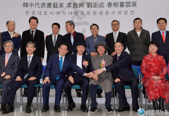 윤장현 광주광역시장이 15일 오후 북구 시립미술관 본관1층 전시장에서 열린 학정 이돈흥 선생과 중국의 최고 작가 리우정청(劉正成) 선생의 2인전 '예결금란' 전시회 개막식에 참석해 쑨시엔위 주광주 중국총영사, 김호철 광주고검장 등 내빈들과 기념촬영을 하고 있다.