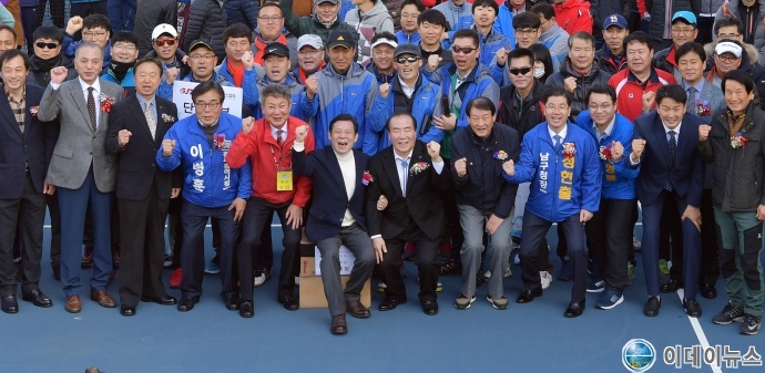 윤장현 광주광역시장이 17일 오전 남구 진월국제테니스장에서 열린 제15회 광주광역시장배 생활체육&전문체육 테니스대회에 참석해 장휘국 광주시교육감, 강철성 광주시테니스협회장, 동호인 등 참석자들과 파이팅을 외치고 있다.