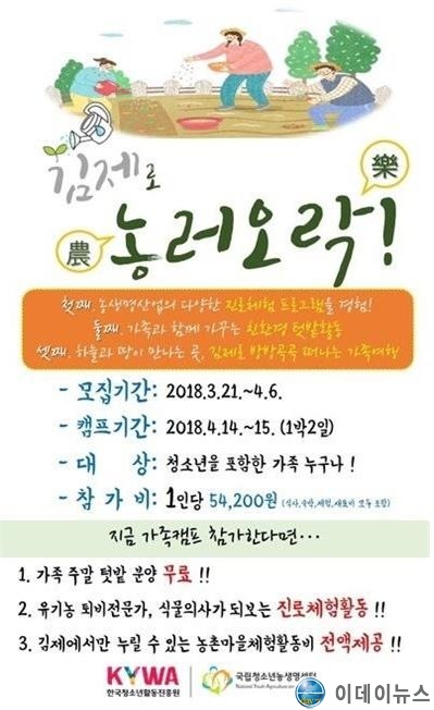 국립청소년농생명센터(원장 양해관, 이하 농생명센터)는 오는21일부터 4월 6일까지 ‘김제로 농(農)러 오락(樂)’ 가족캠프 참가자를 모집한다.