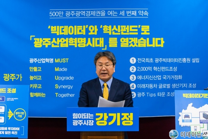 강기정 더불어민주당 광주시장 예비후보가 광주빅데이터진흥원을 설립하고 데이터기반 산업도시를 추진하는 등 500만 광주광역경제권을 선도할 이른바 ‘4차 산업혁명 MUST 4대 분야 10대 전략사업’을 발표했다.