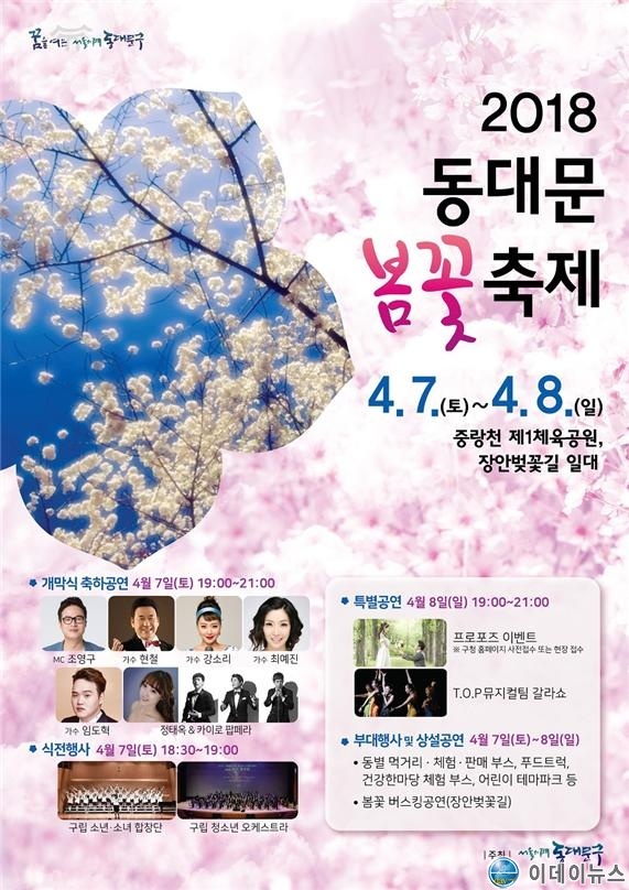 동대문구(구청장 유덕열)는 벚꽃 개화시기에 맞춰 오는 4월 7일(토)부터 8일(일)까지 중랑천 제1체육공원 및 장안벚꽃로에서 ‘2018 동대문 봄꽃축제’를 개최한다.