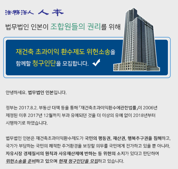 인본 관계자는 "초과이익환수제는 초과이익이 발생하면 의무를 부담하는 게 아니라 재건축 시행을 위한 초기부터 의무를 부담하게 하고 있어, 조합 설립 이전인 추진위 단계더라도 위헌 소송 참여가 가능하다"고 설명했다.
