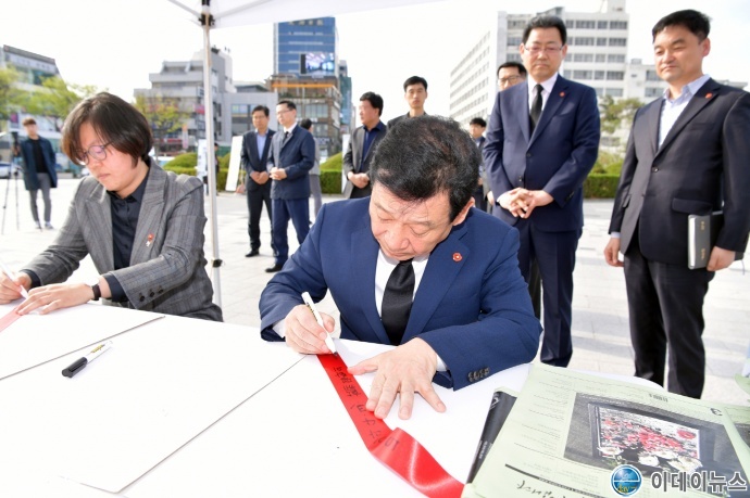 또 윤시장은 방명록에 ‘광주 5·18! 제주 4·3! 인간의 존엄을 향한 동반의 역사입니다. 인권과 평화를 위한 한길로!’라고 적었으며 이와 함께 ‘5·18과 4·3 함께 평화의 길로’라는 문구를 담은 붉은 리본을 분향소에 매달았다.