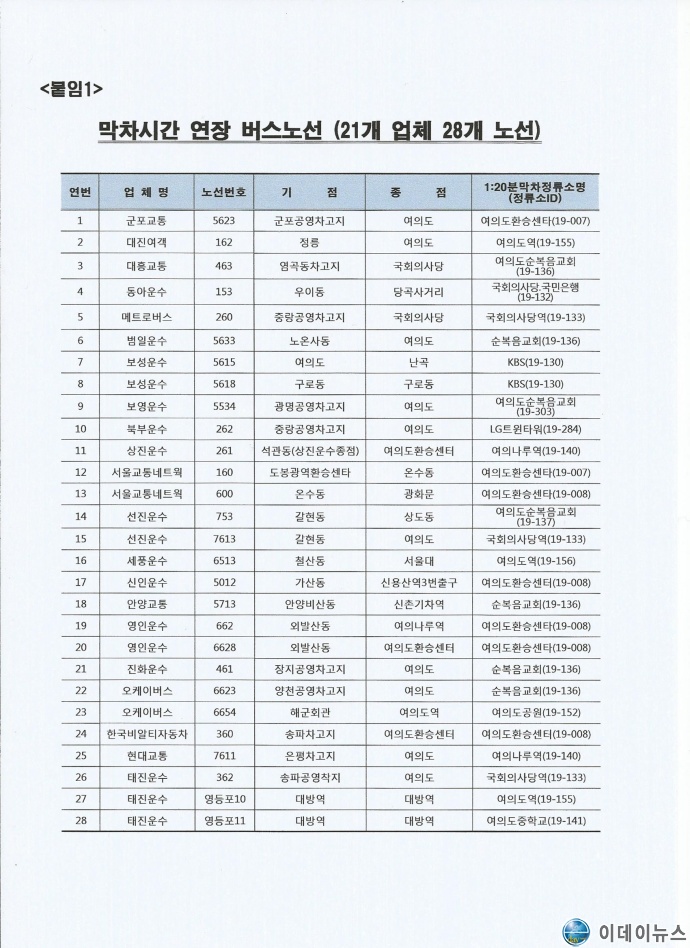 운행이 연장되는 시내버스는 총 28개 노선으로, 여의서로 인근 ▴여의도환승센터 ▴국회의사당역 ▴순복음교회 정류소 등에서 막차가 01시20분에 차고지로 출발한다.
