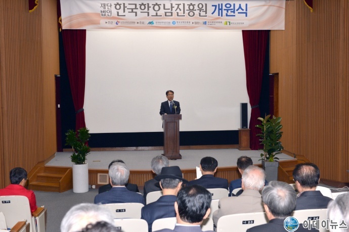 정종제 광주광역시 행정부시장은 6일 오후 공무원교육원에서 열린 한국학호남진흥원 개원식에 참석해 내빈들과 함께 현판 제막식을 한 후 중강단으로 이동해 환영사를 하고 있다.