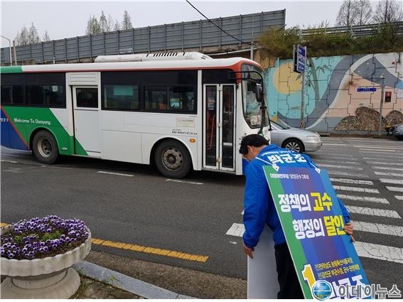 박균조 예비후보는 매일 아침·저녁으로 담양읍 백동사거리에서 출·퇴근길 군민들에게 허리 굽혀 인사하면서 지지를 호소하고 있다.