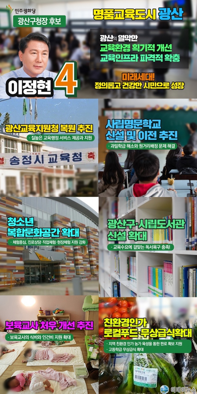 이 후보는 “평소 교육에 대한 투자는 우리 광산의 미래세대에 대한 투자이며 광산발전을 위한 투자라는 신념을 가지고 있다”며 “앞으로도 이런 신념을 바탕으로 우리 아이들이 정의롭고 건강한 시민으로 성장 할 수 있도록 지원과 관심을 아끼지 않겠다”고 했다.