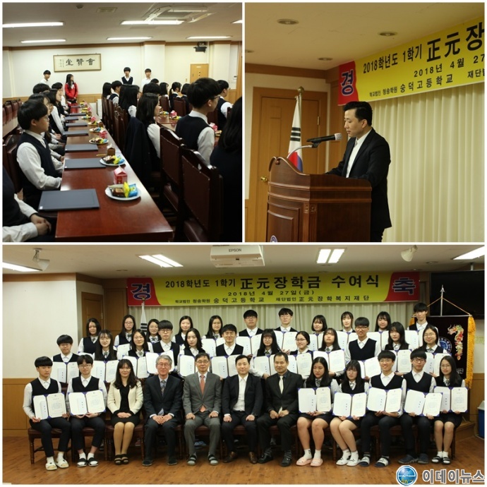 학교법인 청송학원 김용만 이사장은 지난 27일 정원장학복지재단을 통해 숭덕고등학교 재학생 중 바른 인성과 우수한 성적을 인정받은 30명의 학생에게 각각 80만원씩, 2천 400만원의 장학금을 수여했다.