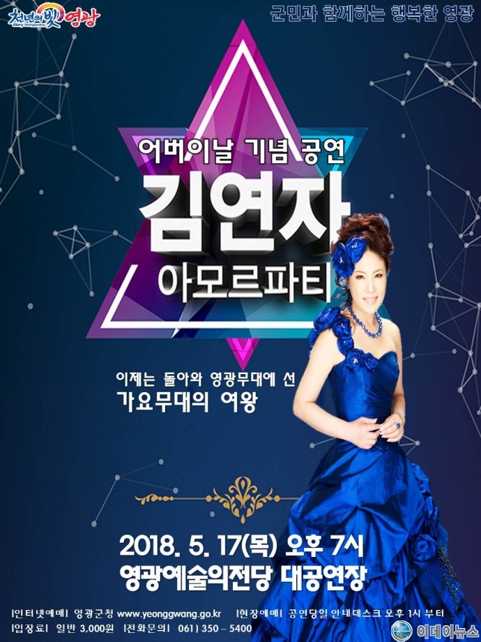5월 17일 저녁 7시에는 어버이날을 기념하여“김연자의 아모르 파티”효(孝) 콘서트가 있다. 세대를 뛰어넘는 음악으로 젊은이들의 마음까지 사로잡아 제2의 전성기를 누리는 데뷔 44년차 가수 김연자가 폭발적인 성량의 라이브 무대를 선사한다.