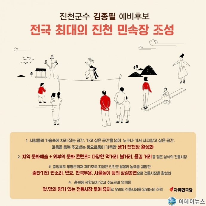 이어 “우리에게는 향수가 깊이 배어 있는 충청북도 무형문화재 제11호로 지정된 진천군 용몽리 농요를 결합해 줄타기와 판소리, 민요, 한국무용, 사물놀이 등의 협업된 상설공연으로 전통시장을 활성화시키겠다.”고 주장했다.