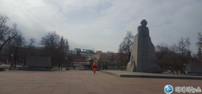 4월21일 아침 일찍 러시아의 수도 모스크바 구경에 나섰다. 볼쇼이 극장 맞은편에 버스가 멈췄다. 이곳에 카를 마르크스(1818~1883) 동상이 있다. 사진을 찍으면서 그를 생각했다.