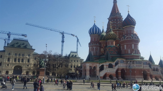 주변의 정교회를 보고 나서 레닌 묘 참배객 줄을 보니 한 시간 정도는 기다려야 될 것 같아 레닌 묘 보는 것을 포기했다. 레닌 묘 입구에서 사진 촬영만 하고 바실리 성당으로 향했다.