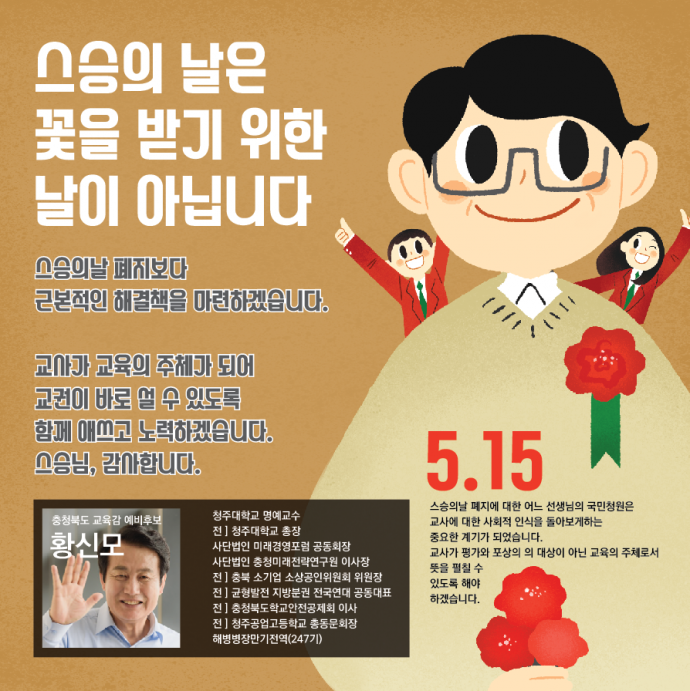 황신모 충북교육감 예비후보는 “최근 청와대 국민청원 게시판에 등록된 ‘스승의 날 폐지 청원’에 대해 ‘교권’이 바로서는 교육풍토 반드시 조성하겠다고 발표했다.