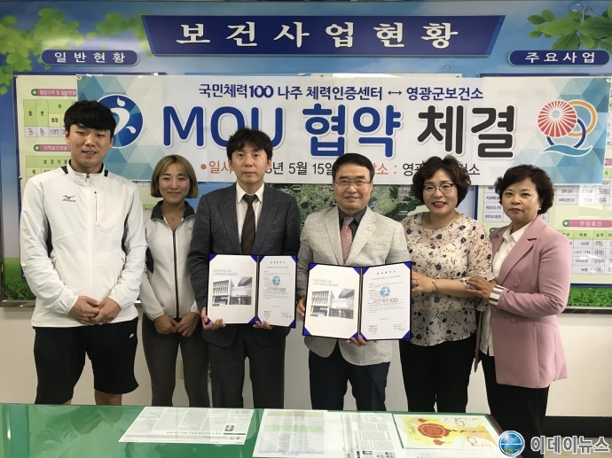 영광군 보건소는 지난15일 건강증진 예방 및 재활 프로그램에 참여하는 군민에게 과학적인 체력측정과 전문가의 맞춤형 운동서비스를 제공해 100세까지 건강을 체계적으로 관리하기 위해 상호 협조 기관인 국민체력 100 나주 체력인증센터와 업무협약을 체결했다.
