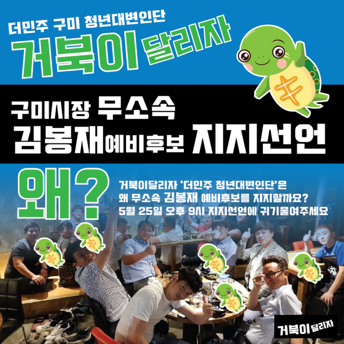 무소속 구미시장 김봉재 예비후보는 더불어민주당 전 구미시장 특정 예비후보의 청년대변인단을 자청했던 ‘거북이 달리자’ 서포터즈단 1백여 명이 25일 오후 9시 본인의 선거사무소에서 지지선언이 있을 예정이라고 밝혔다.