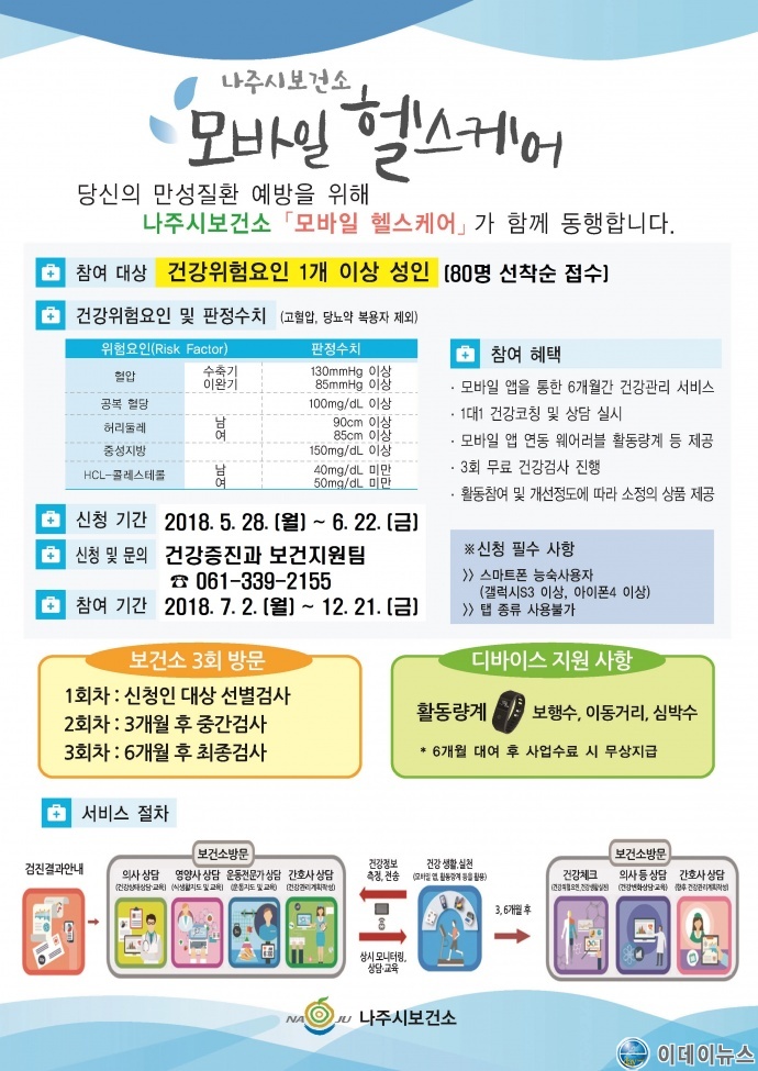 시 보건소는 29일 스마트폰 앱을 활용해, 관내 건강위험군을 대상으로 생활 습관 개선 목표를 이행할 수 있도록 수시 관리해주는 서비스인 ‘모바일 헬스케어’ 사업 참여자를 오는 6월 22일까지 모집한다고 밝혔다.